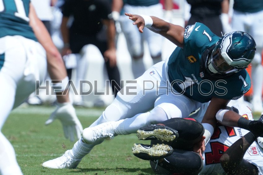 Tampa Bay, Florida, USA, September 28, 2025, Philadelphia Eagles quarterback Jalen Hurts #1 gets tackled on the run at Raymond James Stadium. (Photo Credit: Marty Jean-Louis)