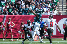 Tampa Bay, Florida, USA, September 28, 2025, Philadelphia Eagles wide receiver Devonta Smith #6 makes a catch at Raymond James Stadium. (Photo Credit: Marty Jean-Louis)