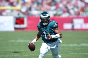 Tampa Bay, Florida, USA, September 28, 2025, Philadelphia Eagles quarterback Jalen Hurts #1 on the run at Raymond James Stadium. (Photo Credit: Marty Jean-Louis)