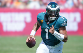 Tampa Bay, Florida, USA, September 28, 2025, Philadelphia Eagles quarterback Jalen Hurts #1 on the run at Raymond James Stadium. (Photo Credit: Marty Jean-Louis)