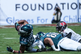 Tampa Bay, Florida, USA, September 28, 2025, Philadelphia Eagles running back Saquon Barkley #26 gets tackled at Raymond James Stadium. (Photo Credit: Marty Jean-Louis)