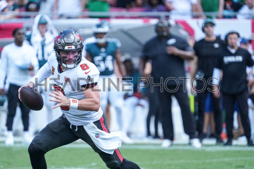 Tampa Bay, Florida, USA, September 28, 2025, Tampa Bay Buccaneers quarterback Baker Mayfield #6 looks to make a pass at Raymond James Stadium. (Photo Credit: Marty Jean-Louis)