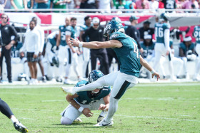 Tampa Bay, Florida, USA, September 28, 2025, Philadelphia Eagles kicker Jake Elliott #4 makes a kick at Raymond James Stadium. (Photo Credit: Marty Jean-Louis)