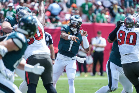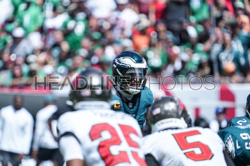 Tampa Bay, Florida, USA, September 28, 2025, Philadelphia Eagles quarterback Jalen Hurts #1 makes a pass at Raymond James Stadium. (Photo Credit: Marty Jean-Louis)