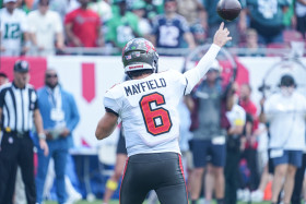 Tampa Bay, Florida, USA, September 28, 2025, Tampa Bay Buccaneers quarterback Baker Mayfield #6 makes a pass at Raymond James Stadium. (Photo Credit: Marty Jean-Louis)