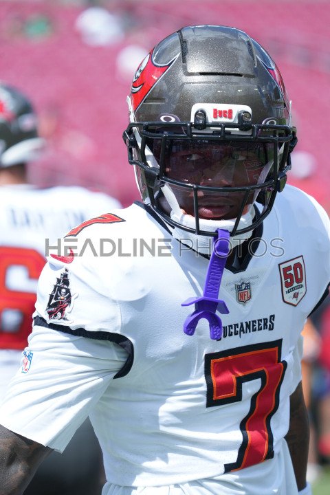 Tampa Bay, Florida, USA, September 28, 2025, Tampa Bay Buccaneers running back Bucky Irving #7 warming up at Raymond James Stadium. (Photo Credit: Marty Jean-Louis)
