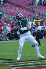 Tampa Bay, Florida, USA, September 28, 2025, Philadelphia Eagles quarterback Jalen Hurts #1 warming up at Raymond James Stadium. (Photo Credit: Marty Jean-Louis)