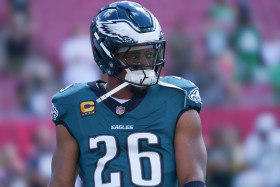 Tampa Bay, Florida, USA, September 28, 2025, Philadelphia Eagles runningback Saquon Barkley #26 warms up at Raymond James Stadium. (Photo Credit: Marty Jean-Louis)