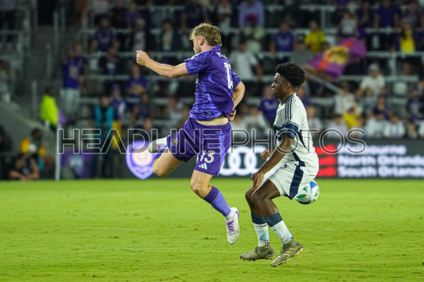Orlando, Florida, USA, October 11, 2025, Orlando City SC forward Duncan McGuire #13 makes a pass mid-air at Inter&Co Stadium. (Photo Credit: Marty Jean-Louis)