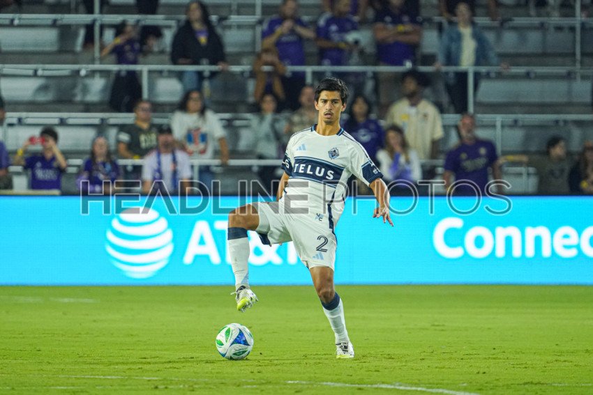 Orlando, Florida, USA, October 11, 2025, Vancouver Whitecaps FC defender Mathías Laborda #2 stops the ball after receiving a pass at Inter&Co Stadium. (Photo Credit: Marty Jean-Louis)