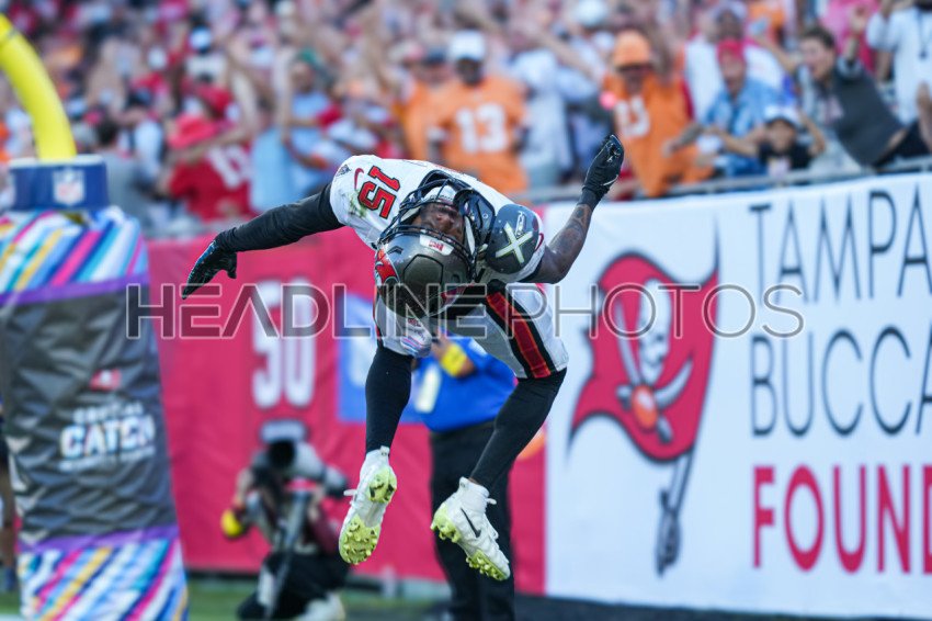 Tampa Bay, Florida, USA, October 12, 2025, Tampa Bay Buccaneers wide receiver Tez Johnson #15 celebrate with a flip after making a touchdown at Raymond James Stadium. (Photo Credit: Marty Jean-Louis)