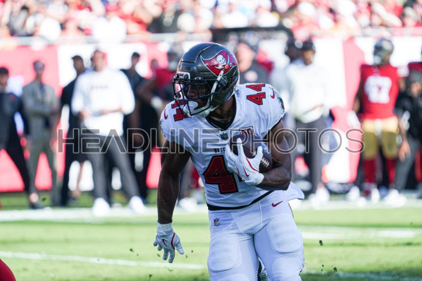 Tampa Bay, Florida, USA, October 12, 2025, Tampa Bay Buccaneers player Sean Tucker #44 on the run at Raymond James Stadium. (Photo Credit: Marty Jean-Louis)