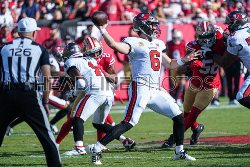 Tampa Bay, Florida, USA, October 12, 2025, Tampa Bay Buccaneers Baker Mayfield #6 makes a pass at Raymond James Stadium. (Photo Credit: Marty Jean-Louis)