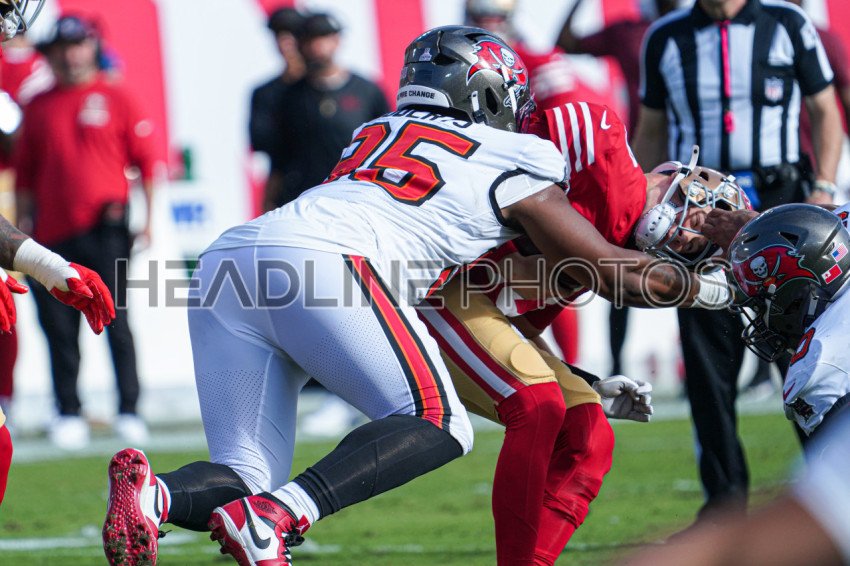 Tampa Bay, Florida, USA, October 12, 2025, San Francisco 49ers quarterback Mac Jones #10 is tackled by Elijah Roberts #95 at Raymond James Stadium. (Photo Credit: Marty Jean-Louis)