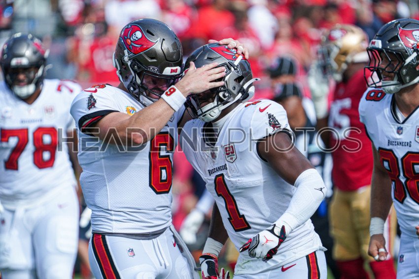 Tampa Bay, Florida, USA, October 12, 2025,Tampa Bay Buccaneers quarterback Baker Mayfield #6 and Running back Rachaad White #1 celebrate a play at Raymond James Stadium. (Photo Credit: Marty Jean-Louis)