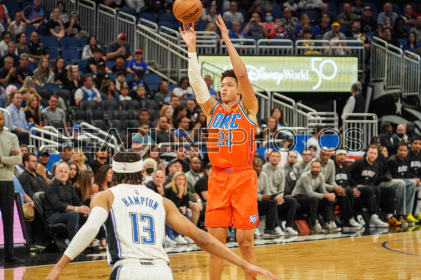 Orlando, Florida, USA, March 20, 2022, Oklahoma Thunder Power Forward Isaiah Roby #22 shoots. a three point shot at the Amway Center. (Photo Credit: Marty Jean-Louis)