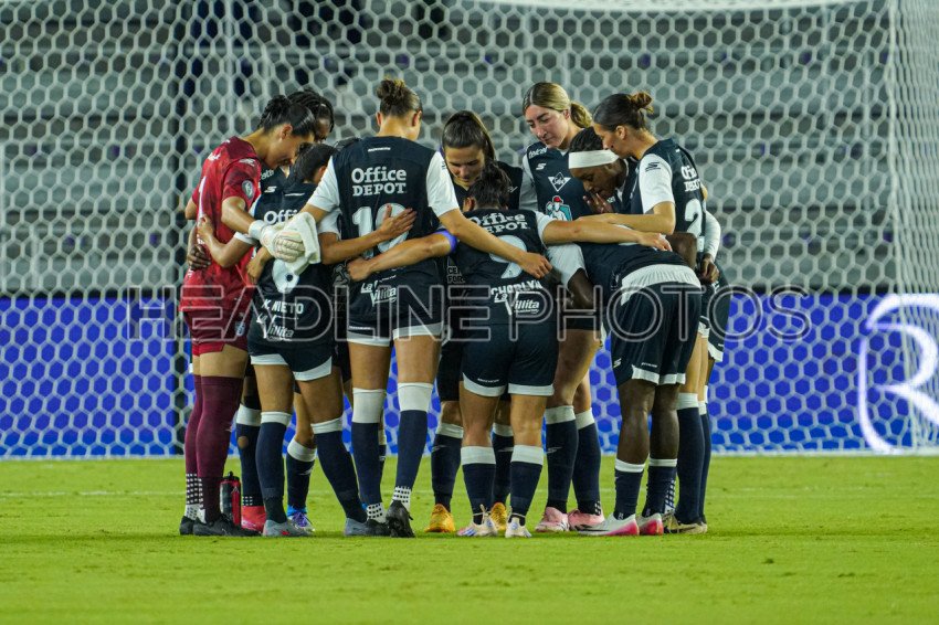 Orlando, Florida, USA, October 15, 2025, CF Pachuca Femenil players huddle before the opening kickoff during the Concacaf W Champions Cup at Inter&Co Stadium. (Photo Credit: Marty Jean-Louis)