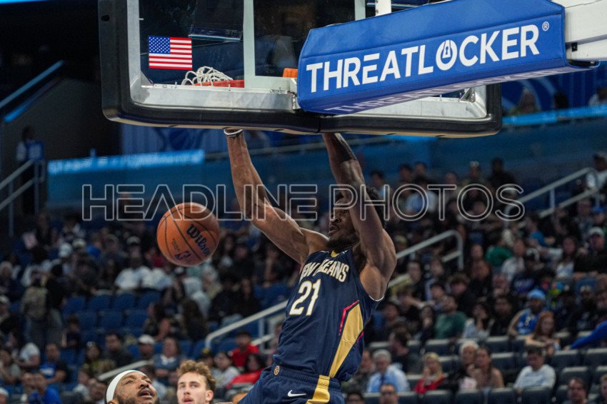 Orlando, Florida, USA, October 16, 2025, New Orleans Pelicans center Yves Missi #21 makes a dunk at the Kia Center. (Photo Credit: Marty Jean-Louis)