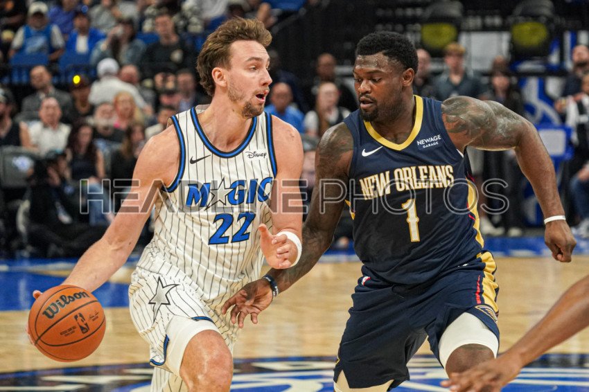 Orlando, Florida, USA, October 16, 2025, Orlando Magic forward Franz Wagner #22 attempt to run pass Zion Williamson #1 at the Kia Center. (Photo Credit: Marty Jean-Louis)