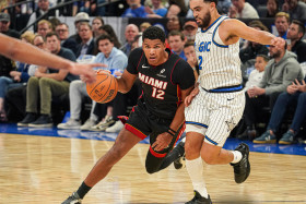 Orlando, Florida, USA, October 22, 2025, Miami Heat player Dru Smith #12 rushes forward at the Kia Center. (Photo Credit: Marty Jean-Louis)