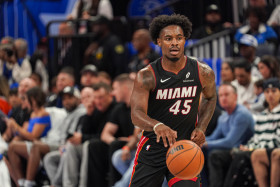 Orlando, Florida, USA, October 22, 2025, Miami Heat guard Davion Mitchell #45 rushes forward at the Kia Center. (Photo Credit: Marty Jean-Louis)