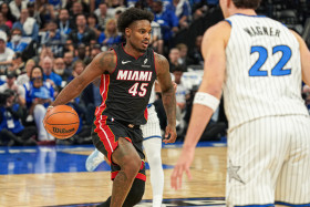 Orlando, Florida, USA, October 22, 2025, Miami Heat guard Davion Mitchell #45 runs forward at the Kia Center. (Photo Credit: Marty Jean-Louis)