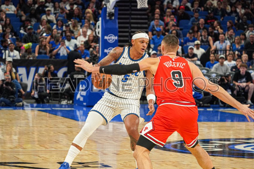 Orlando, Florida, USA, October 25, 2025, Orlando Magic forward Paolo Banchero #5 attempt to run pass Nikola Vucevic #9 at the Kia Center. (Photo Credit: Marty Jean-Louis)