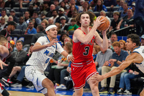 Orlando, Florida, USA, October 25, 2025, Chicago Bulls guard Josh Giddey #3 runs towards the basket at the Kia Center. (Photo Credit: Marty Jean-Louis)