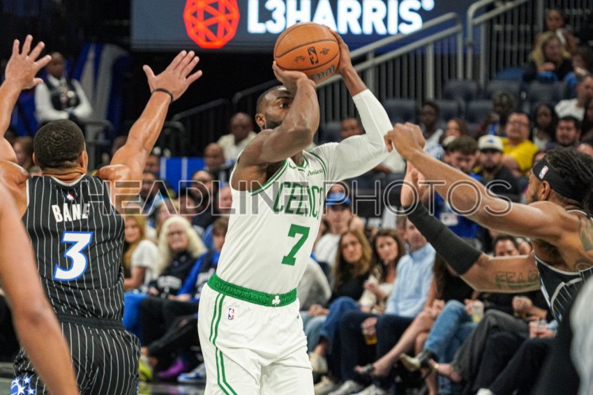 Orlando, Florida, USA, November 7, 2025, Boston Celtics forward Jaylen Brown #7 shoots a three at the Kia Center. (Photo Credit: Marty Jean-Louis)
