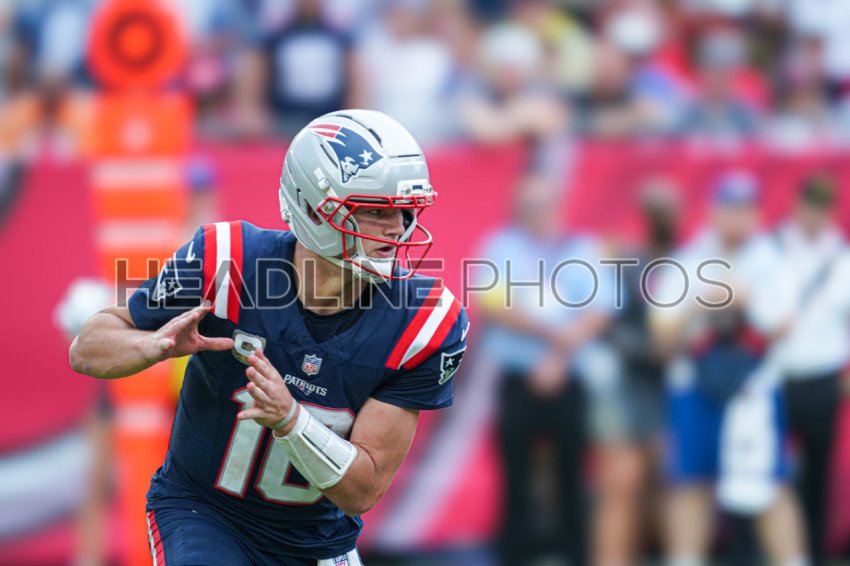 Tampa Bay, Florida, USA, November 9, 2025, New England Patriots quarterback Drake Maye #10 fakes a pass at Raymond James Stadium. (Photo Credit: Marty Jean-Louis)