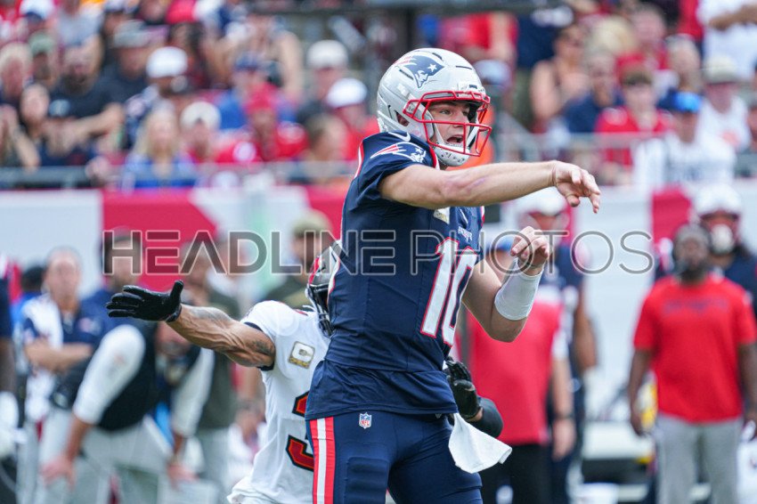 Tampa Bay, Florida, USA, November 9, 2025, New England Patriots quarterback Drake Maye #10 makes a pass at Raymond James Stadium. (Photo Credit: Marty Jean-Louis)