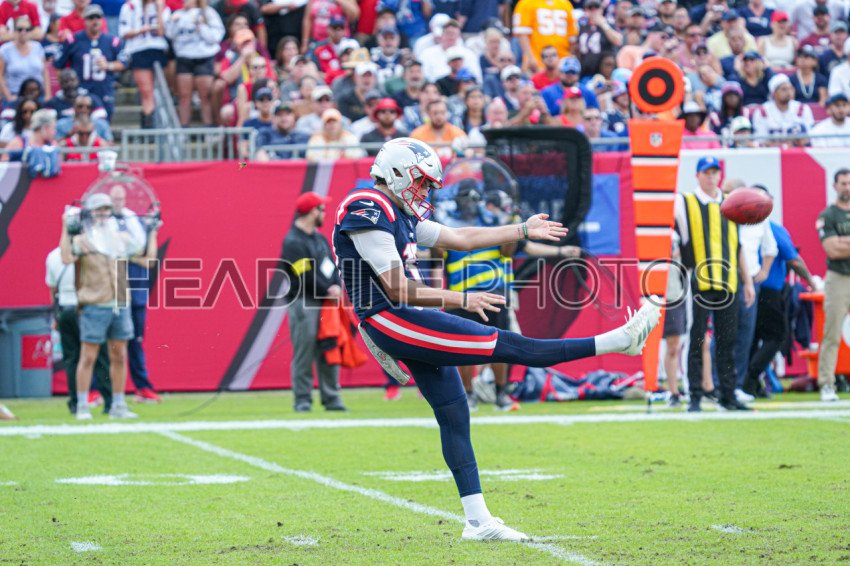 Tampa Bay, Florida, USA, November 9, 2025, New England Patriots punter Bryce Baringer #17 makes a punt at Raymond James Stadium. (Photo Credit: Marty Jean-Louis)