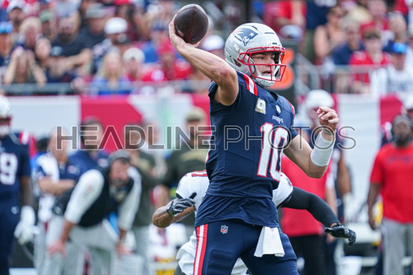 Tampa Bay, Florida, USA, November 9, 2025, New England Patriots quarterback Drake Maye #10 makes a pass at Raymond James Stadium. (Photo Credit: Marty Jean-Louis)