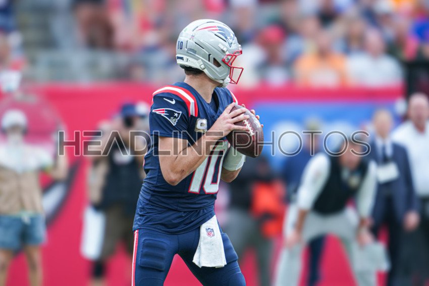 Tampa Bay, Florida, USA, November 9, 2025, New England Patriots quarterback Drake Maye #10 readies to make a pass at Raymond James Stadium. (Photo Credit: Marty Jean-Louis)