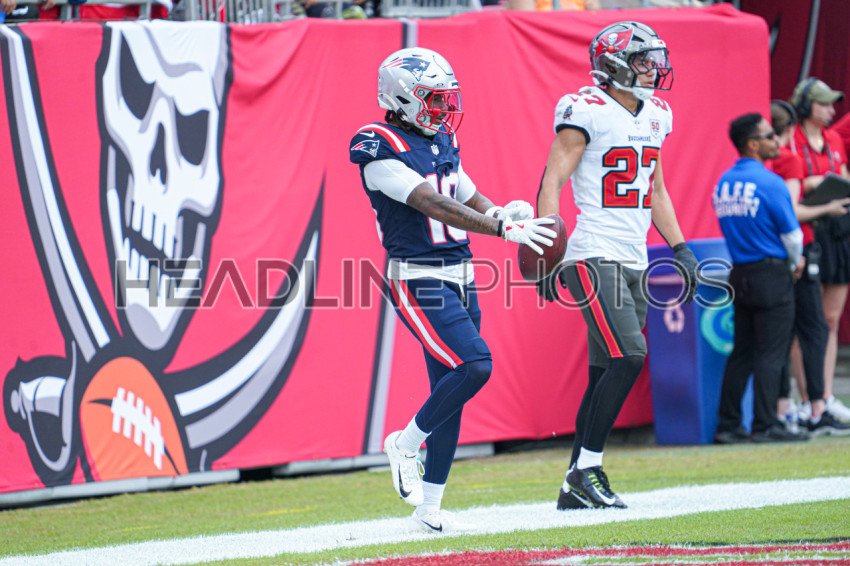 Tampa Bay, Florida, USA, November 9, 2025, New England Patriots wide receiver Kyle Williams #18 celebrate after making a touchdown at Raymond James Stadium. (Photo Credit: Marty Jean-Louis)