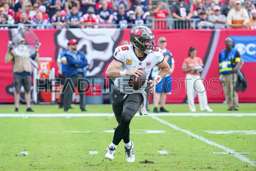 Tampa Bay, Florida, USA, November 9, 2025, Tampa Bay Buccaneers quarterback Baker Mayfield #6 on the run at Raymond James Stadium. (Photo Credit: Marty Jean-Louis)