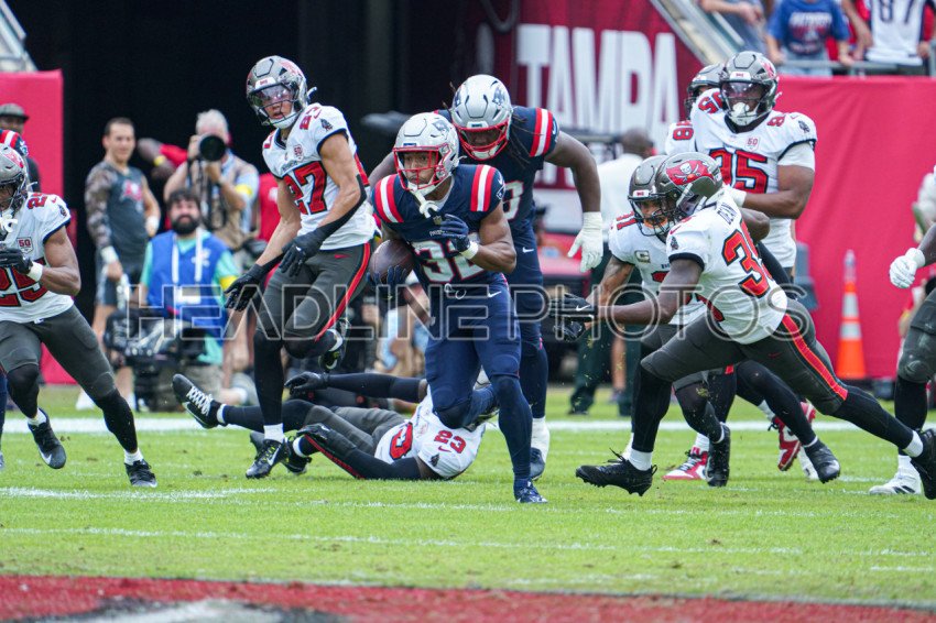 Tampa Bay, Florida, USA, November 9, 2025, New England Patriots running back TreVeyon Henderson #32 makes a run at Raymond James Stadium. (Photo Credit: Marty Jean-Louis)