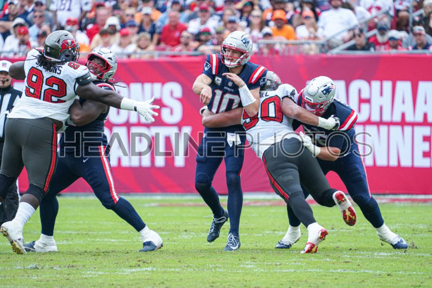 Tampa Bay, Florida, USA, November 9, 2025, New England Patriots quarterback Drake Maye #10 makes a pass at Raymond James Stadium. (Photo Credit: Marty Jean-Louis)