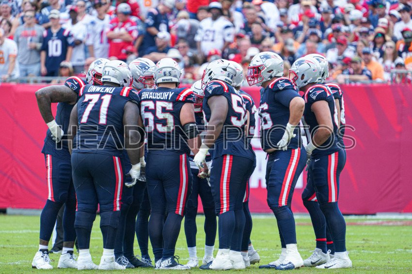 Tampa Bay, Florida, USA, November 9, 2025, New England Patriots players huddle at Raymond James Stadium. (Photo Credit: Marty Jean-Louis)