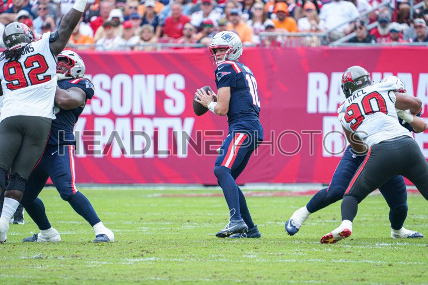 Tampa Bay, Florida, USA, November 9, 2025, New England Patriots quarterback Drake Maye #10 readies to make a pass at Raymond James Stadium. (Photo Credit: Marty Jean-Louis)