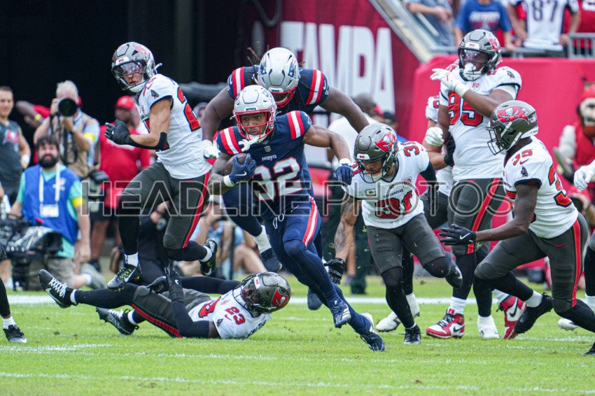 Tampa Bay, Florida, USA, November 9, 2025, New England Patriots running back TreVeyon Henderson #32 makes a run at Raymond James Stadium. (Photo Credit: Marty Jean-Louis)