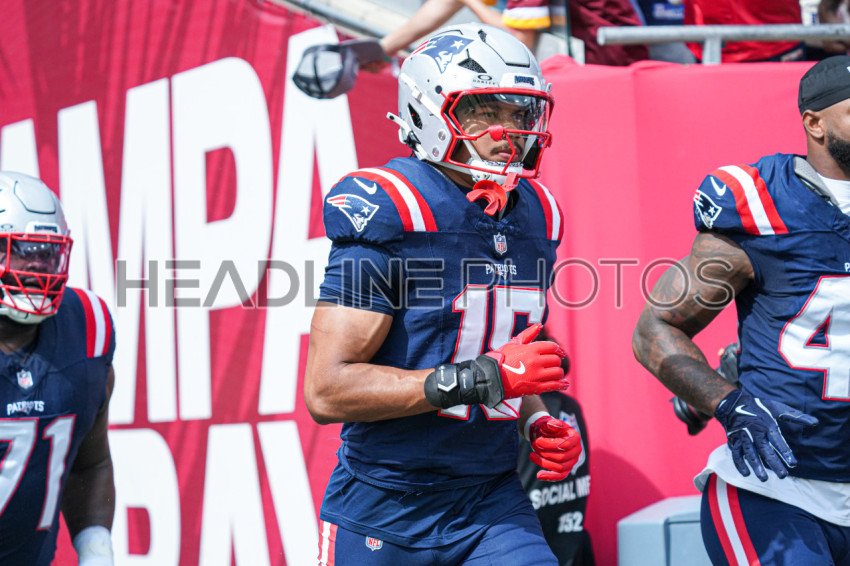 Tampa Bay, Florida, USA, November 9, 2025, New England Patriots player Marte Mapu #15 runs out of the tunnel at Raymond James Stadium. (Photo Credit: Marty Jean-Louis)