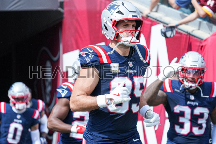 Tampa Bay, Florida, USA, November 9, 2025, New England Patriots tight end Hunter Henry #85 runs out of the tunnel at Raymond James Stadium. (Photo Credit: Marty Jean-Louis)