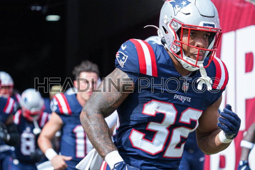 Tampa Bay, Florida, USA, November 9, 2025, New England Patriots running back TreVeyon Henderson #32 runs out of the tunnel at Raymond James Stadium. (Photo Credit: Marty Jean-Louis)