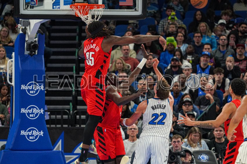 Orlando, Florida, USA, November 10, 2025, Portland Trail Blazers center Robert Williams III #35 blocks a shot from Franz Wagner #22 at the Kia Center. (Photo Credit: Marty Jean-Louis)