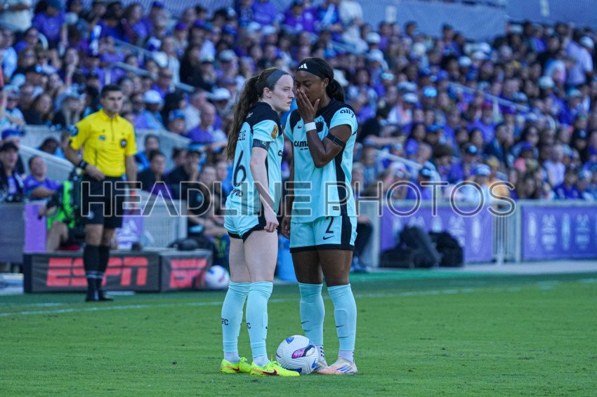 Orlando, Florida, USA, November 16, 2025, Gotham FC players Rose Lavelle and Jaedyn Shaw #2 have a conversation before the free kick at Inter&Co Stadium. (Photo Credit: Marty Jean-Louis)