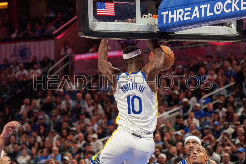 Orlando, Florida, USA, November 18, 2025, Golden State Warriors player Jimmy Butler #10 makes a dunk at the Kia Center. (Photo Credit: Marty Jean-Louis)