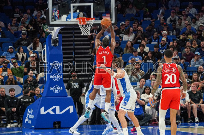 Orlando, Florida, USA, November 20, 2025, Los Angeles Clippers guard James Harden #1 shoots a three at the Kia Center. (Photo Credit: Marty Jean-Louis)