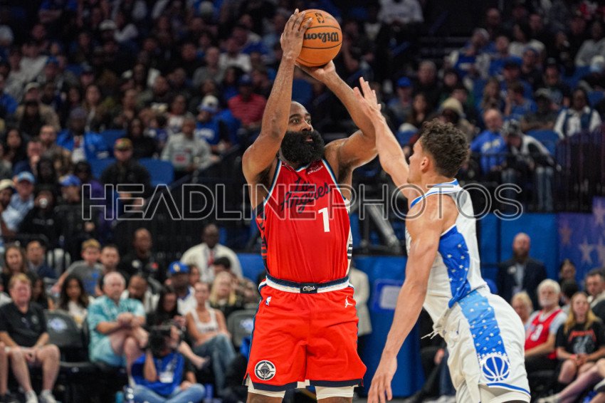 Orlando, Florida, USA, November 20, 2025, Los Angeles Clippers guard James Harden #1 shoots a three at the Kia Center. (Photo Credit: Marty Jean-Louis)