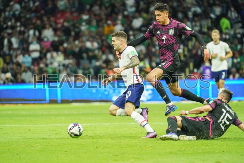 Mexico City, Mexico, March 24, 2022, USA forward Christian Pulisic #10 gets fouled by Edson Omar Alvarez Velezquez #4 in the 2022 World Cup Qualifier at Allianz Field. (Photo Credit: Marty Jean-Louis)